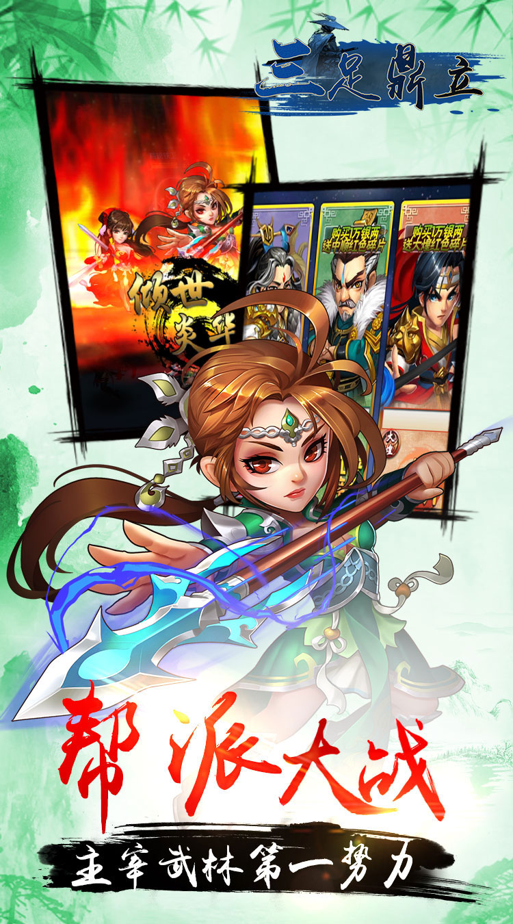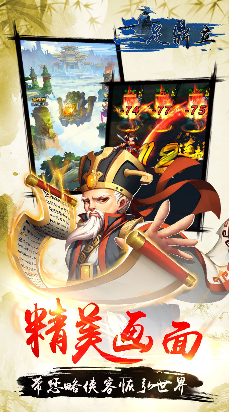 《三足鼎立》是一款原汁原味武侠风Q版立体卡牌游戏。游戏讲述了作为主角的你与李玄策携手行走江湖,笑看风云,在庙堂和江湖纷争中不断或长的故事。高度还原,重温雪刀历程,经典桥段高度重现,人物造型、场景画面、剧情发展契合剧情,重温经典;经典角色倾情呈现,百位经典侠客集结,承载无限热血与感动,踏上江湖历练之路;经典剧情独创特色玩法,胭脂榜、庐山论武、豪侠冲榜,江湖热血,快意恩仇;羁绊侠客,双剑合璧,星垂平野、天人合一等经典侠客技能通过羁绊侠客合击释放,伤害爆炸,拳拳到肉!雪中江湖客,侠者少年行!我与君同游,万难皆可平!