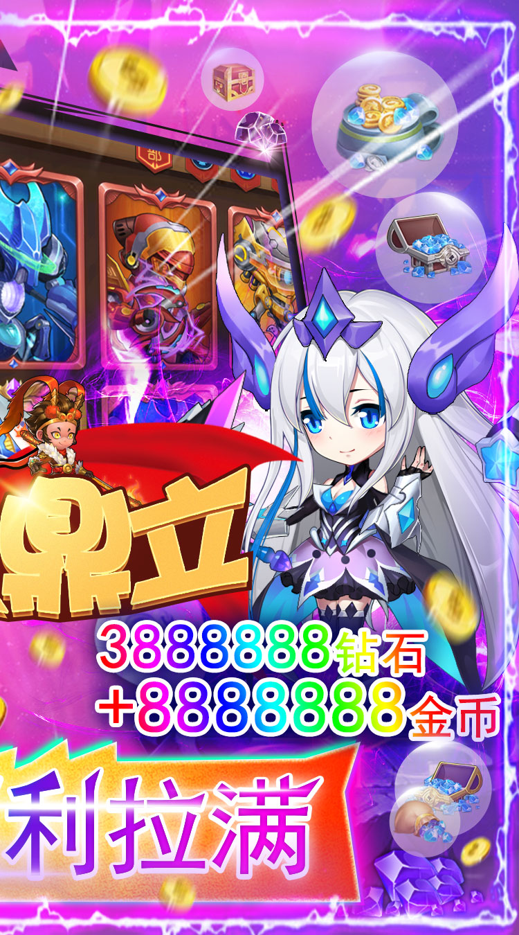 充值比例:1:20000钻石 上线福利: 福利1:上线加礼包码共可领取3888888钻石+8888888金币,开局福利拉满! 福利2:首充直接送满VIP,VIP特权全享不等待! 福利3:闯关、挂机、爬塔手动赚取高级召唤卡,高级英雄随便抽! 福利4:首充就送终极SS英雄,直升9星! 福利5:火力全开,累计8天送豪礼,累计登录送强力SS级英雄 福利6:首充双倍钻石,加速培养英雄阵容!