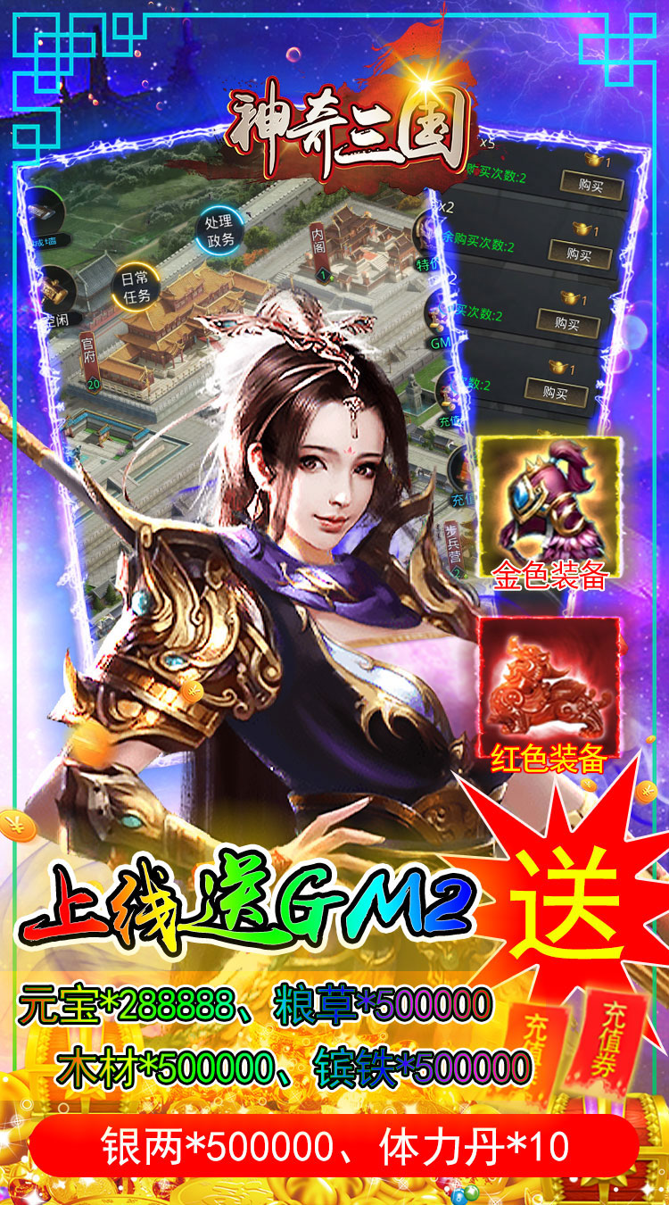 充值比例1:2000元宝 上线福利: 福利1:上线送GM2、元宝*288888、粮草*500000、木材*500000、镔铁*500000、银两*500000、体力丹*10 福利2:七日登录送充值券、金色装备、红色装备、女将碎片、超强武将典韦,大量材料等您来领取! 福利3:充值券商城,随便买买买! 福利4:在线奖励、每日签到、冲级豪礼领取大量充值券,福利领不停 福利5:推图领卡,通关副本领取大量材料以及充值券! 福利6:一元抢购,充值1元即可获得超值大礼包,助你畅玩三国