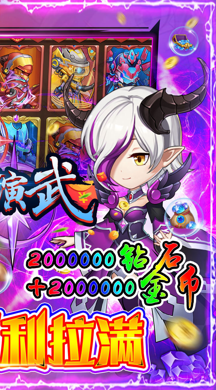 充值比例:1:20000 货币:钻石 类型:卡牌回合 上线福利: 福利1:上线2000000钻石+2000000金币,开局福利拉满! 福利2:创角送VIP15,VIP礼包免费领取! 福利3:开服7天每日海量钻石、金币、材料、顶级5星英雄领到手软! 福利4:GM 商店高级召唤卡、英雄本体、升阶材料只需1钻石购买! 福利5:火力全开,至尊月卡只需1元! 福利6:首充双倍钻石,加速培养英雄阵容!