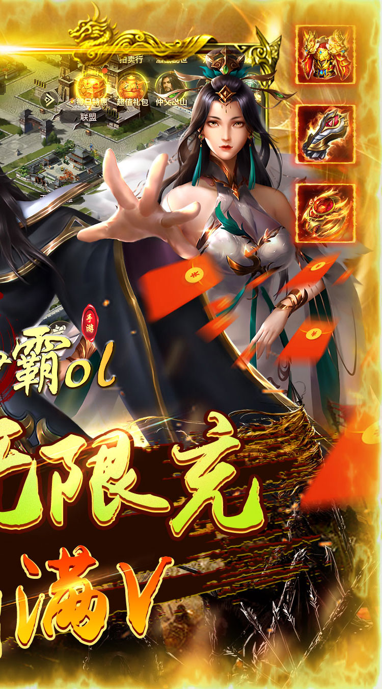 充值比例: 1:500元宝 上线福利: 福利1:充值比例1:500! 福利2:上线满V,送无限送抽卡、无限资源卡! 福利3:GM免充签到送万元充值卡! 福利4:充值卡,材料免费送,神将培养不用愁! 福利5:充值永久0.1折!
