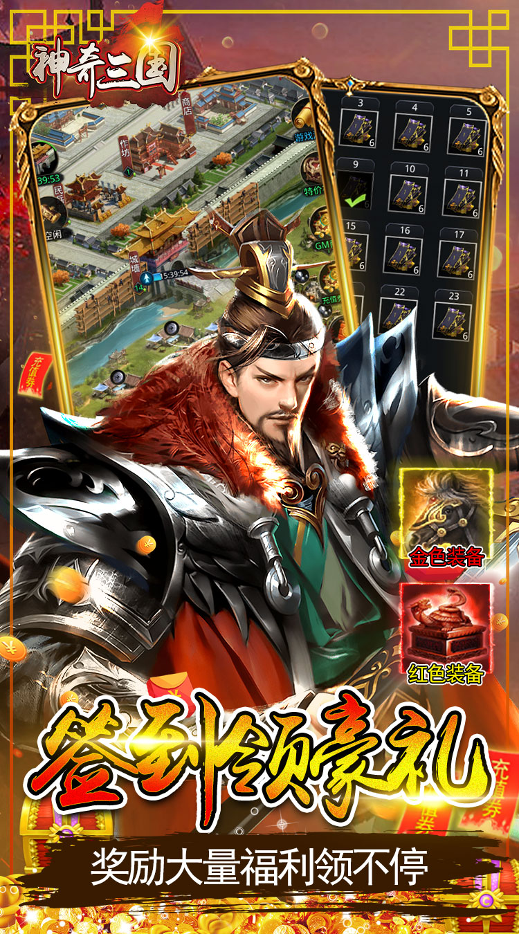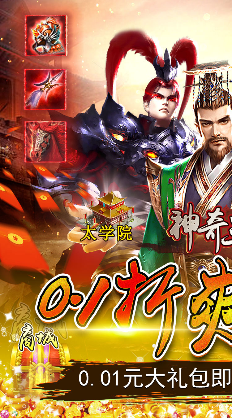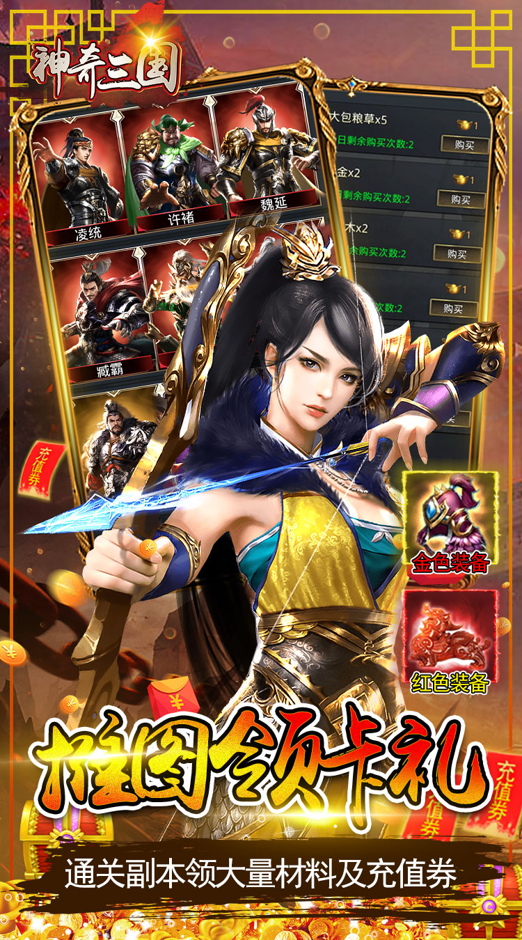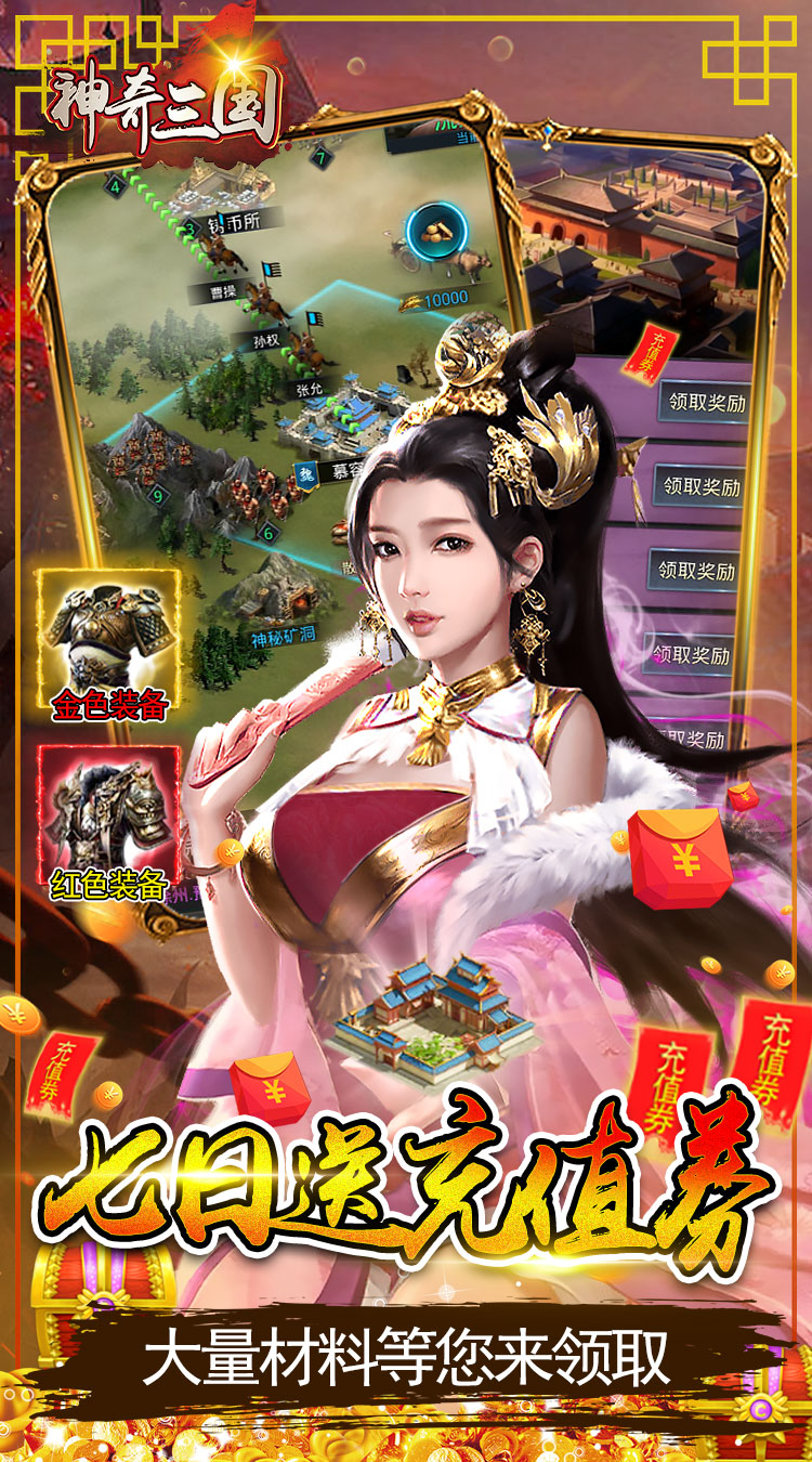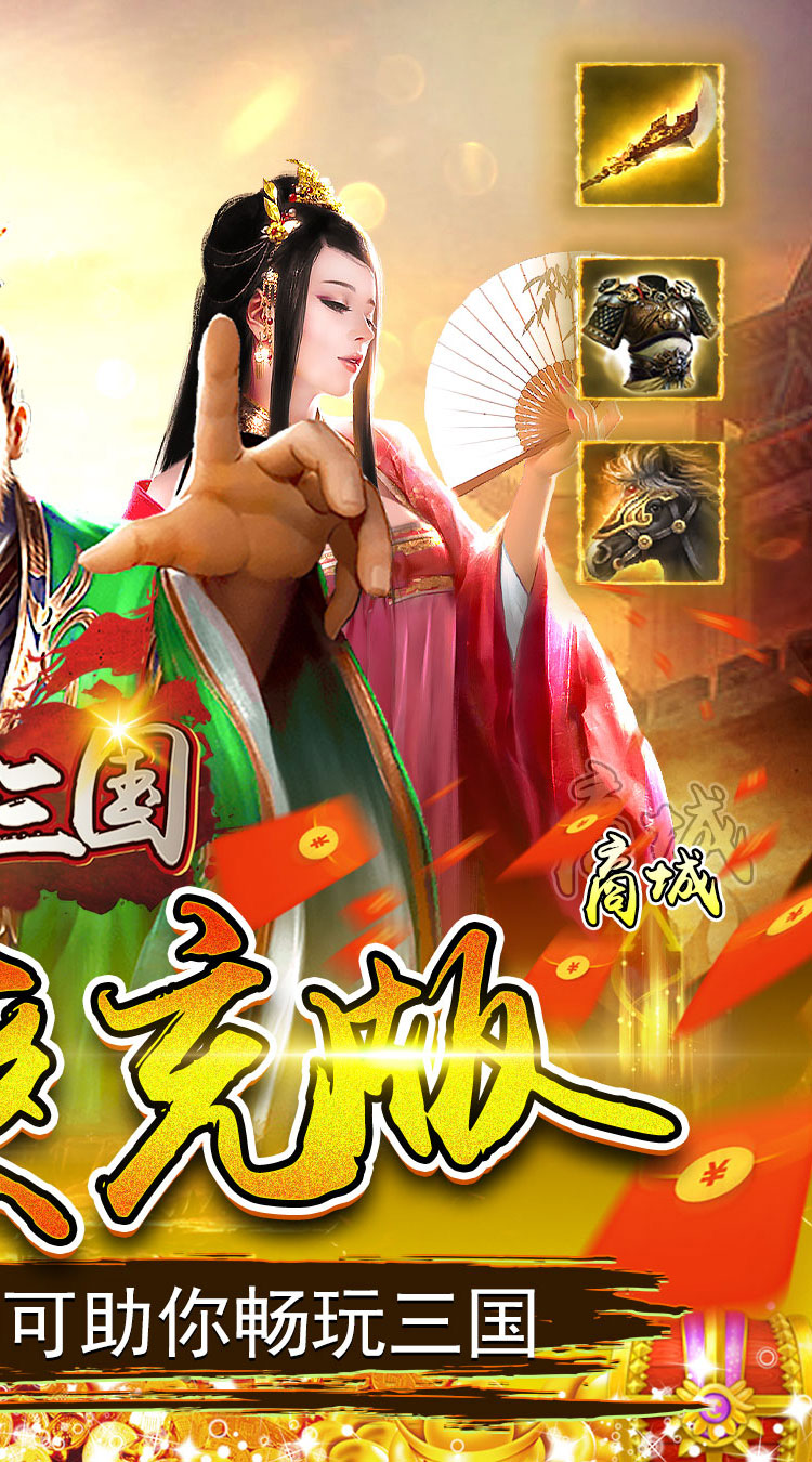 货币:元宝 充值比例:1:200 一、 上线福利 福利1:上线送VIP16、元宝*288888、粮草*500000、木材*500000、镔铁*500000、银两*500000、体力丹*10 福利2:七日登录送充值券、金色装备、红色装备、女将碎片、超强武将典韦,大量材料等您来领取! 福利3:充值券商城,随便买买买! 福利4:在线奖励、每日签到、冲级豪礼领取大量充值券,福利领不停 福利5:推图领卡,通关副本领取大量材料以及充值券! 福利6:一元抢购,实际充值0.01元即可获得超值大礼包,助你畅玩三国