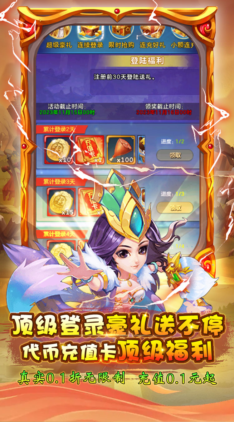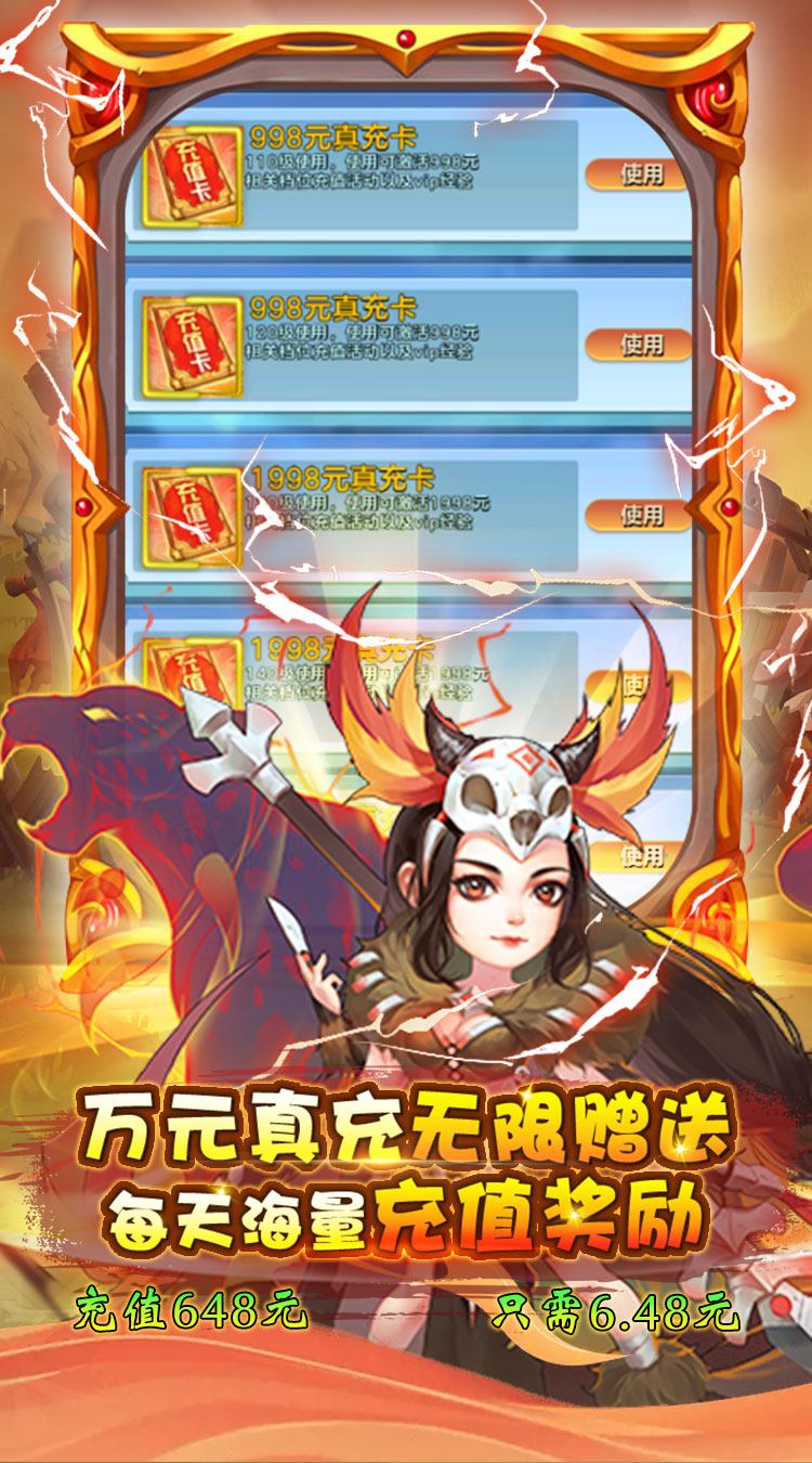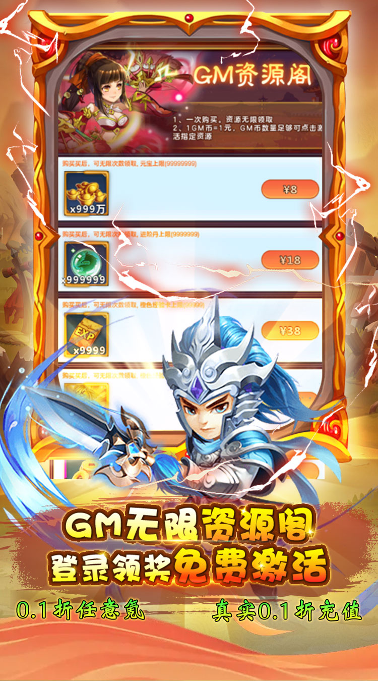 货币:元宝 充值比例:1:2000 一、上线福利 福利1:真实0.1折充值,充值648元只需要6.48元 福利2:创角就送VIP15、金币888万、元宝88万、体力5000、万元真充。 福利3:超级壕礼,全场金色英雄统统自选 福利4:每日登录送GM币,免费激活 [无限资源] 特权,激活无限领取无限资源。 福利5:连续登录天天送真充卡、海量体力,一键扫荡轻松玩。