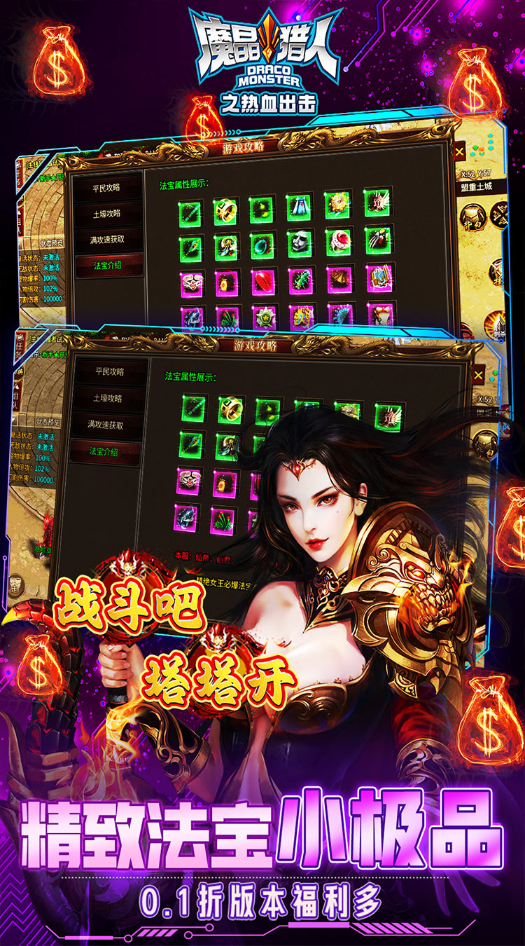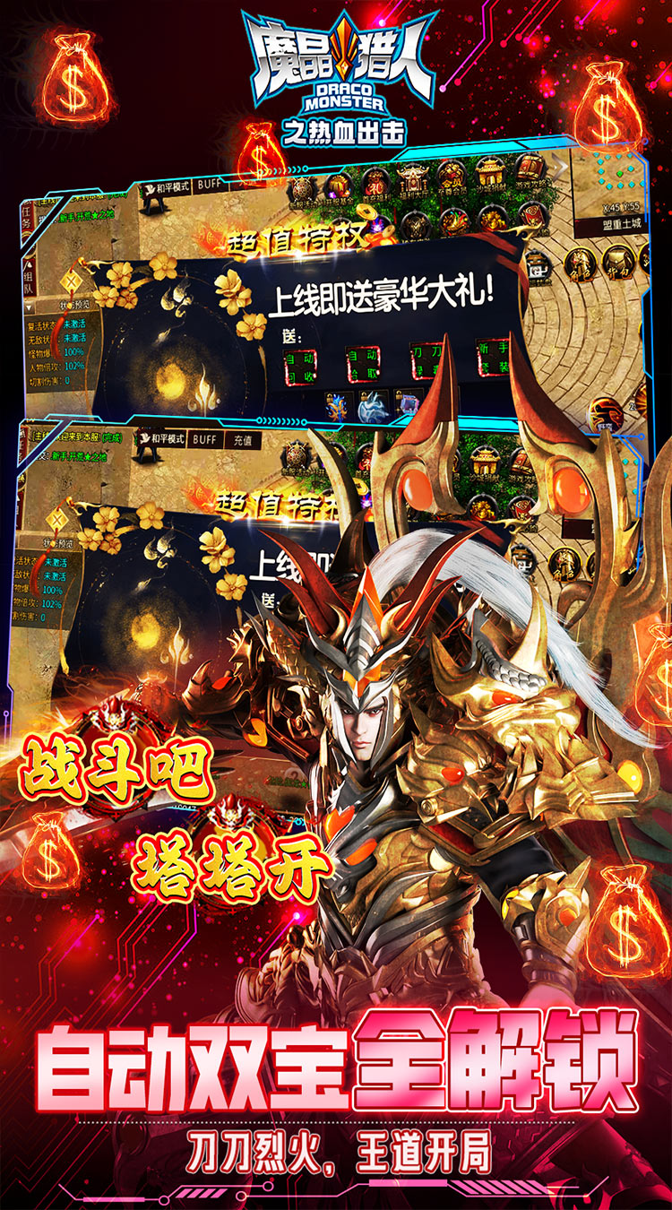 《魔晶猎人之热血出击(0.1折塔塔开)》是一款超燃激情战斗无限刀版本传奇;创角就送自动回收,自动拾取并且直接满攻速,不玩付费套路;0.1折版本充值直接648秒变6.48元;奖励丰厚,养成路线清晰明了不搞复杂,杀怪还能领充值券,爽歪歪;另有小极品神器,装备均有独特属性加成,玩法千万,真的好玩!