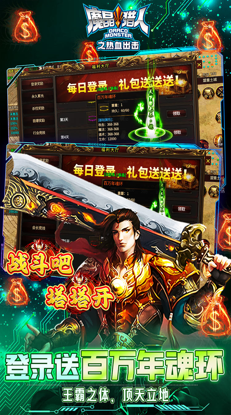 货币:钻石 充值比例1:1000 上线福利 福利1:创角送自动回收:自动拾取:刀刀绿毒:切割神器:满攻速盾牌 福利2:每日签到送百万年魂环 福利3:砍怪悬赏,免费得充值卡,砍就对了 福利4:首爆奖励自动发放,海量资源等你来拿 福利5:小极品神装,属性各异,特效超模,真的好玩