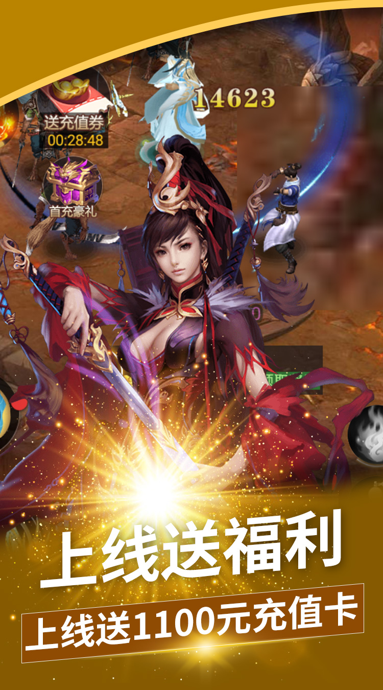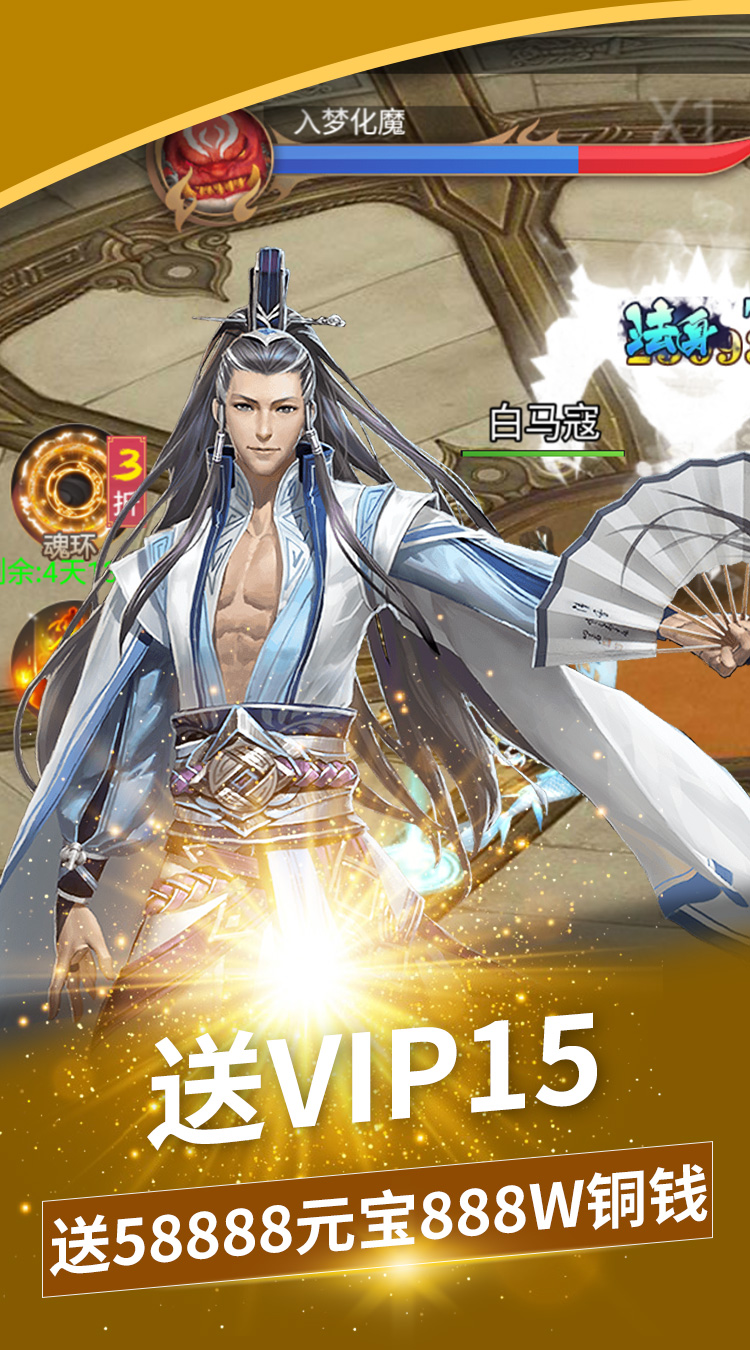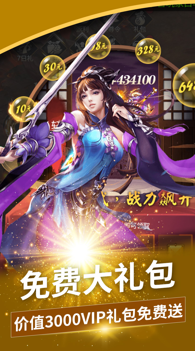 充值比例1:500 上线福利: 福利1,赠送1100元充值,输入礼包码:VIP888。 福利2,上线赠送:V15,元宝*58888,铜钱*8888888 福利3,充值转盘无限转:每天在线30分钟即可使用(10连转)。 福利4,7天登陆送法身蛮王+时装清霜如镜+绝版神器:凤凰天诛+大量稀有道具 福利5,免费领取总价值3000RMB的VIP1-VIP15大礼包 福利6,首冲送绝世魔剑轩辕剑战力暴涨150000