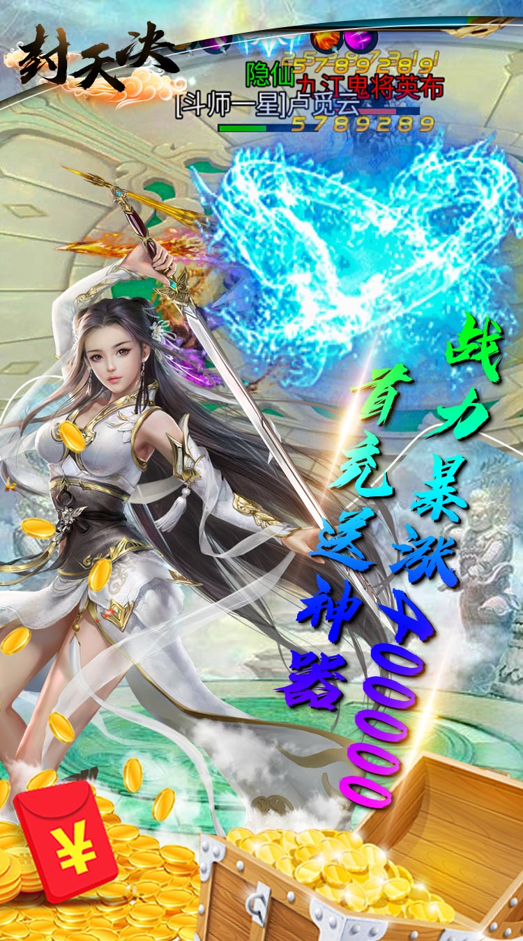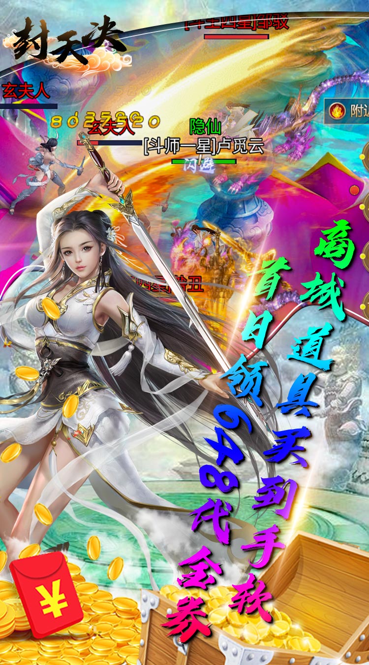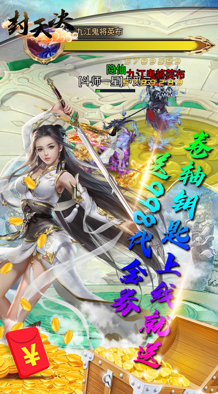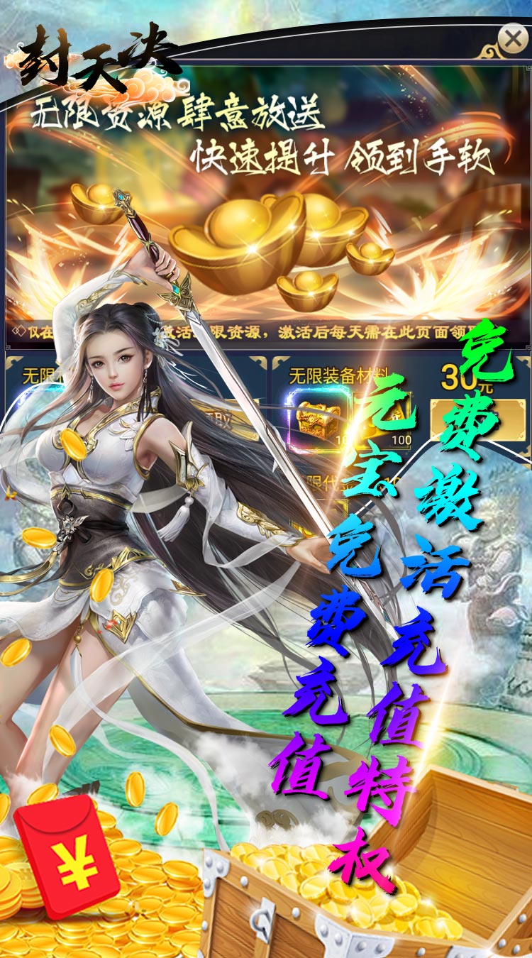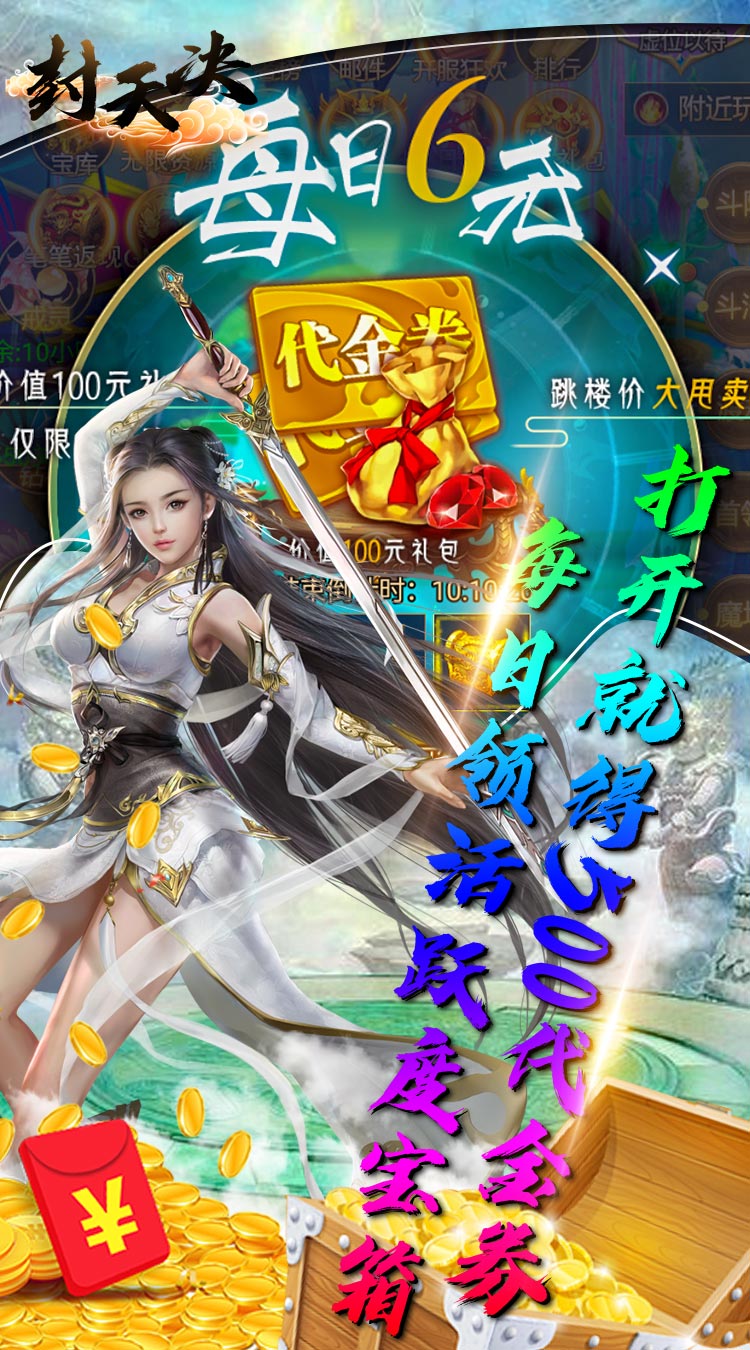 封天决(免费元宝版)来玩登录就送至尊5,998代金券,功法卷轴10000个,金箱钥匙10000个,登录第一天在七日礼免费领取648个代金券,游戏可仙魔灵3种族切换,各类法宝多重变身,脚踩法轮、背装翅膀、怀抱美人。在这里你将转世到虚构的修真世界展开一段全新里程,游戏内用现代时尚的观念全新演绎神兵。