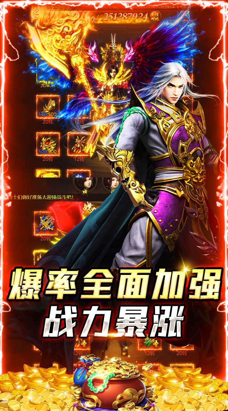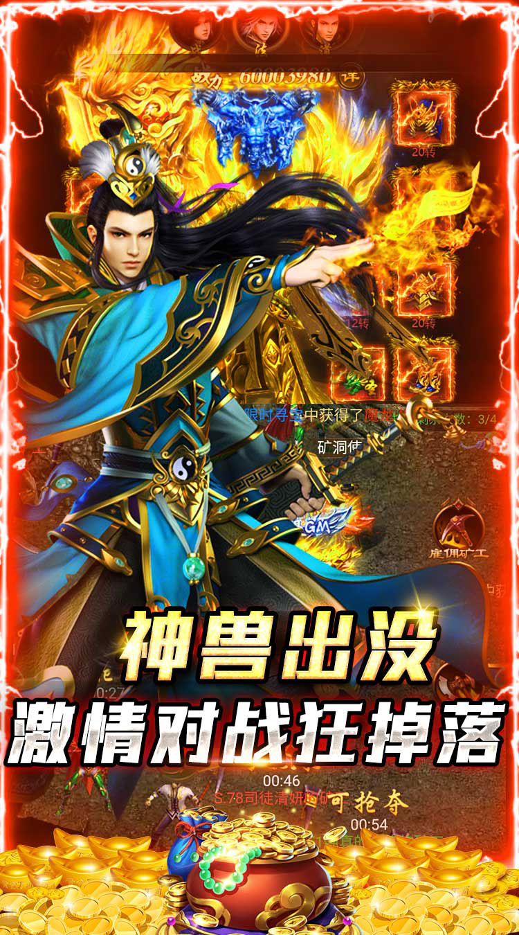 充值比例 1:500 福利1、上线即免费领VIP3,尊享vip贵族特权; 福利2、上线赠送元宝*12000、金币*2880000、强化石*300; 福利3、游戏内每天活跃就可抢红包,打BOSS还能掉落充值券; 福利4、无门槛开通GM特权,获取专属GM福利,每天登录就可领取充值券; 福利5、拥有超值线下活动返利和高额货币返利,燃爆传奇;