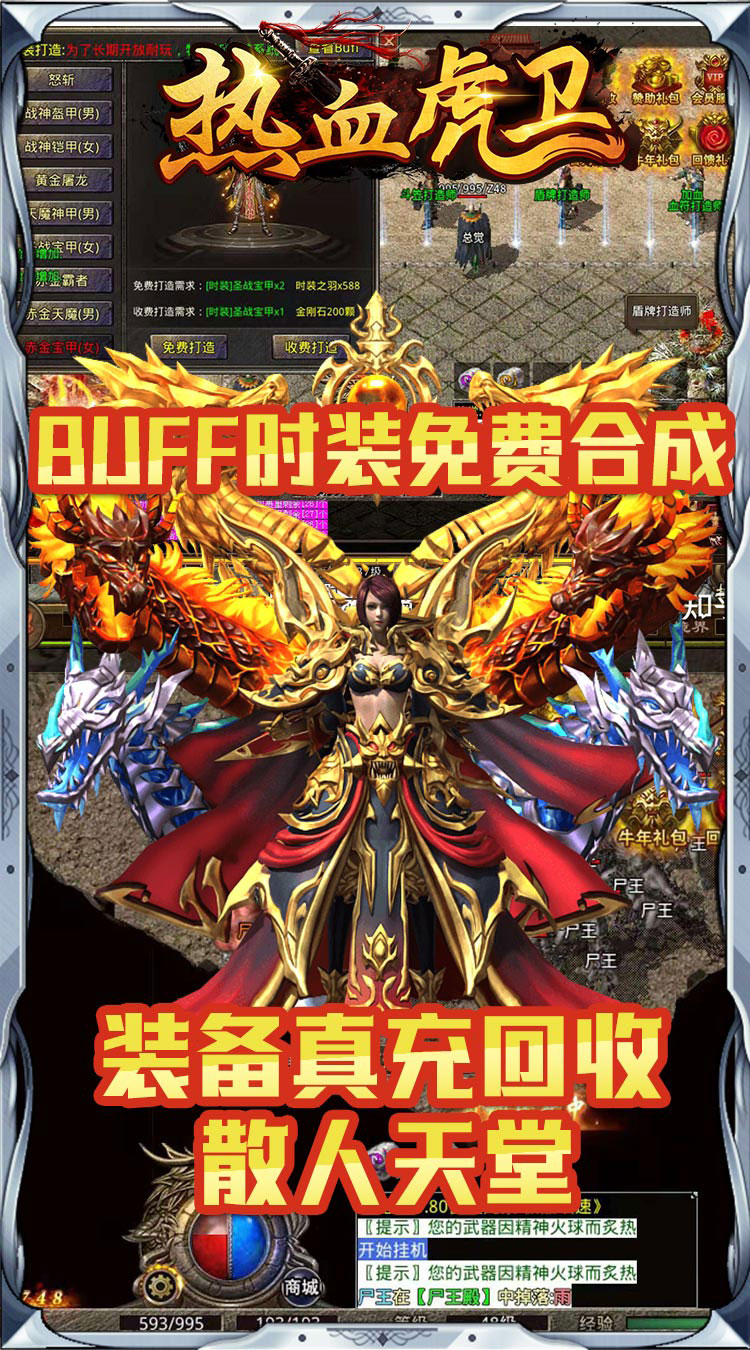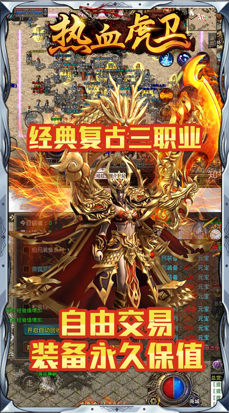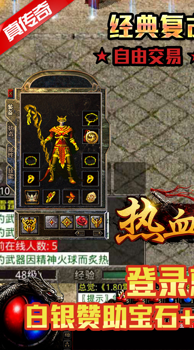 充值比例 1:4000 1、上线送白银赞助宝石+杀怪爆率1.5倍(礼包输入888888兑换) 2、会员服务证+青铜赞助宝石(背包领取) 3、自由交易,散人打金,真充回收,装备保值 4、时装免费打造,配套超强buff属性