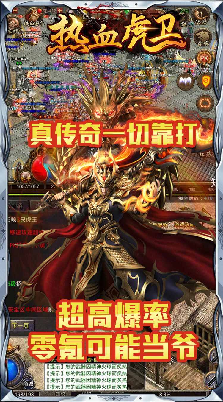 热血虎卫(阳光微变)是一款复古画风十足的1.80雷霆元素传奇游戏,其以新技术重塑玛法大陆,在经典的职业设定中,让你自由选择三大职业角色!通过无限挑战击杀BOSS,获得超高爆率的装备道具,在挂机系统中,能够自动刷怪并完成主线。如此热血的传奇游戏,快来与兄弟们一起组队征战热血沙场,开启一场旷世之战!